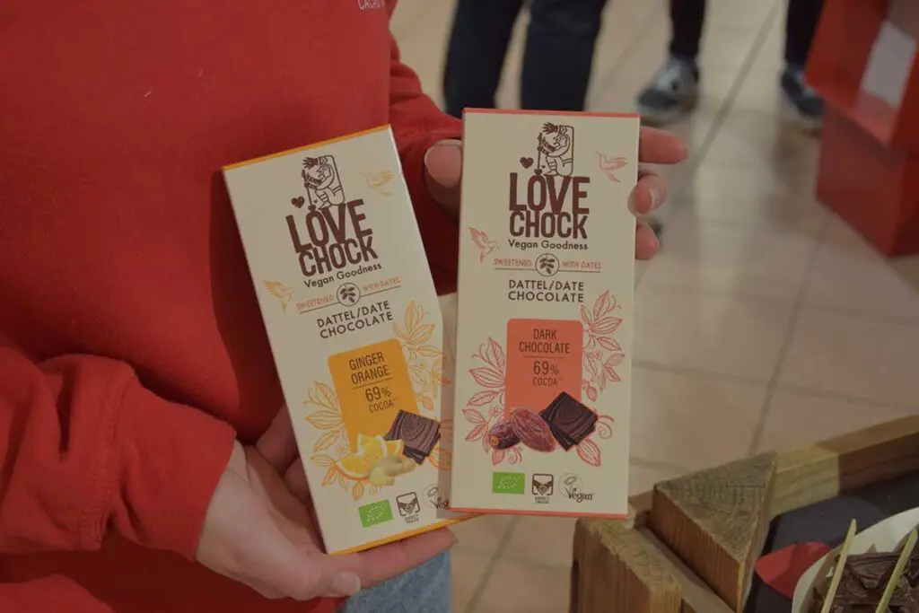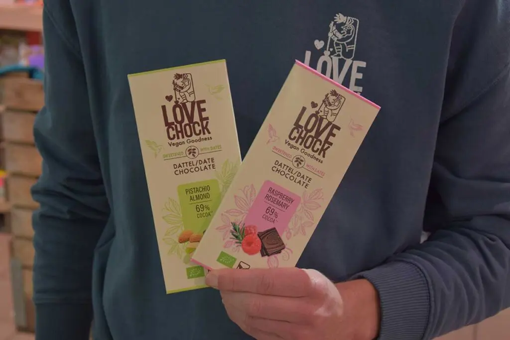 Ook op het gebied van verpakking loopt Lovechock voorop. Het binnenzakje is volledig thuis composteerbaar en de buitenverpakking is gemaakt van recyclebaar materiaal. Het assortiment bestaat uit drie duidelijke lijnen. De klassieke repen, met Almond Fig als iconische eerste. De Cacao Magic lijn met 30 procent minder suiker, gezoet met inuline en ruwe rietsuiker. En de nieuwste dadellijn, volledig gezoet met alleen dadels. Deze serie bestaat uit pure chocolade en spannende combinaties zoals framboos met rozemarijn, gember met sinaasappel, pistache en passievrucht met mango.